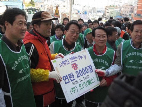 희창물산(주) 임직원들은 2010년 11월 27일 추운겨울을 맞이해 부산 서구 남부민동 일대에 연탄을 필요로 하는 우리 주변의 어려운 이웃에게 사랑의 연탄을 배달하기 위해 직접 나섰다.