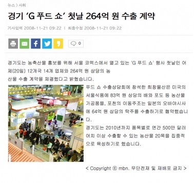 'G 푸드 쇼' 첫날 264억원 수출 계약 [ⓒ '글로벌 종합일간지' 아시아투데이] 경기도는 농축산물 홍보를 위해 서울 코엑스에서 열고 있는 'G 푸드 쇼' 행사 첫날인 20일 12개국 14개 업체와…