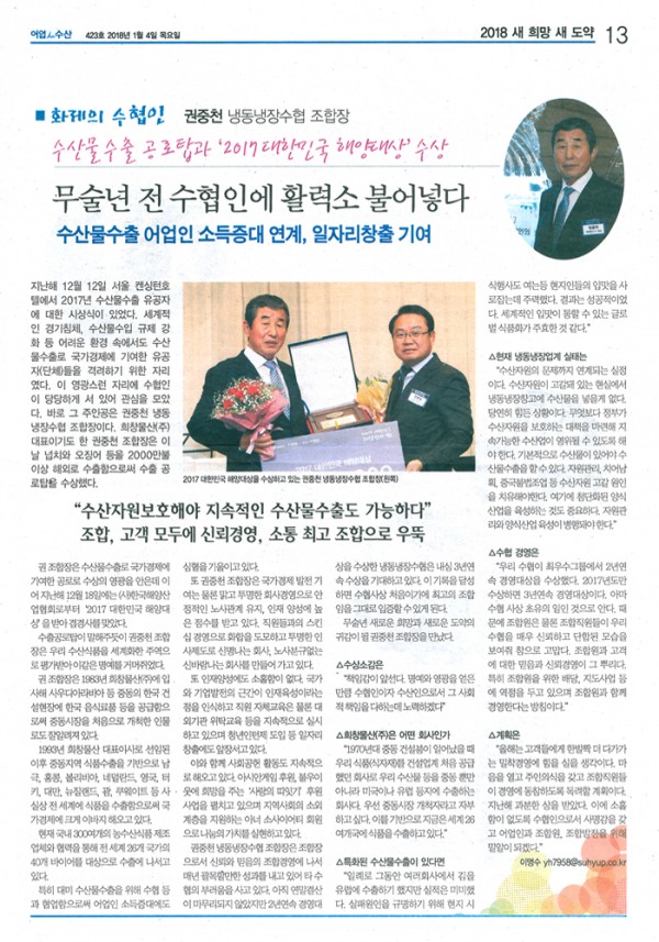 지난해 12월 12일 서울 켄싱턴호텔에서 2017년 수산물수출 유공자에 대한 시상식이 있었다. 세계적인 경기침체, 수산물수입 규제 강화 등 어려운 환경 속에서도 수산물수출로 국가경제에 기여한 유공자(단체)들을 격려하기 위한 자리였다. 이 영광스런 자리에 수협인이 당당하게 서 있어 관심을 모았다. 바로 그 주인공은 권중천 냉동냉장수협 조합장이다. 희창물산(주) 대표이기도 한 권중천 조합장은 이날 넙치와 오징어 등을 2000만불 이상 해외로 수출함으로써 수출 공로탑을 수상했다.
