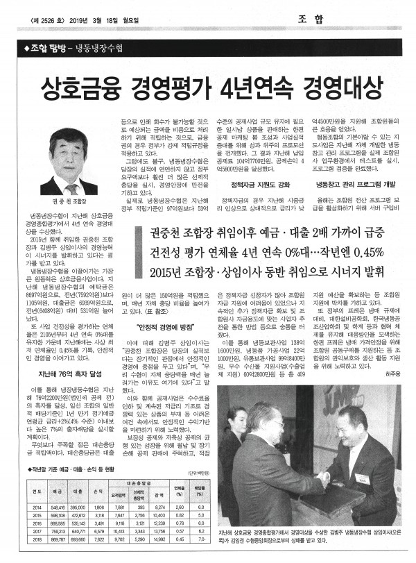권 조합장과 김 상임이사가 조합을 맡은 4년 만에 예금은 3213억7100만 원, 대출 2989억3000만 원이 증가했고 연체율은 2.60%에서 0.45%로 낮추는 실적을 기록한 것이다. 수협중앙회에서 2018 년도 연체율 관리 최우수 조합으로 선정하는 등 클린조합으로도 인정받았다.